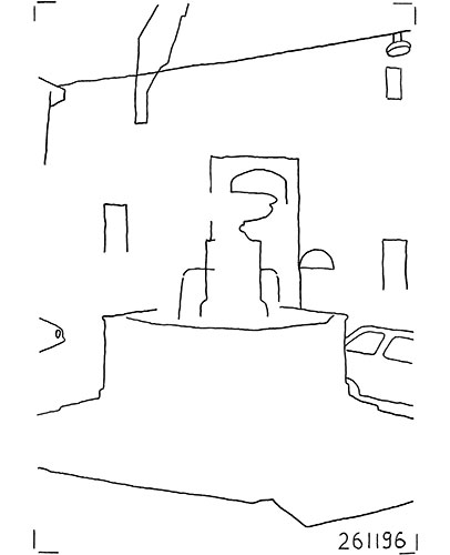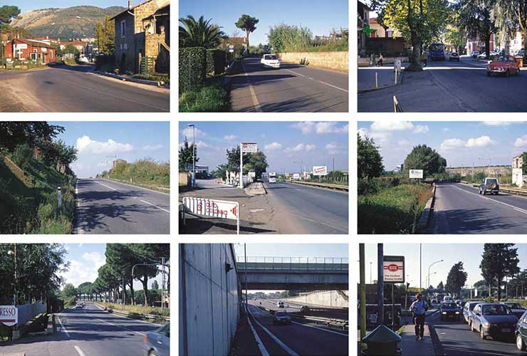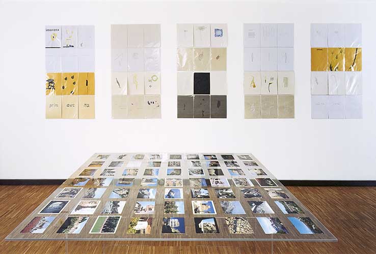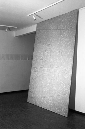 Eine Wanderung durch die Campagna, Ausstellung im Kunsthaus Erfurt, 1997 | Postkarte nach Zeichnung | Raumobjekt nach Zeichnung, Öl auf Leinwand | Buch zur Ausstellung | Fotodokumentation des Fußmarsches von Olevano Romano nach Roma termini, Diaprojektion | ||||||||