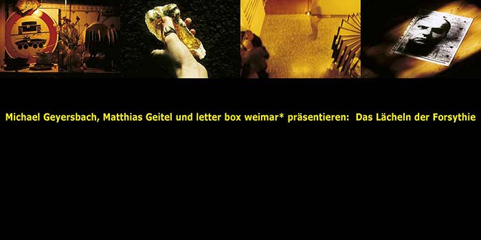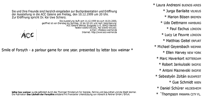 Im Kulturstadtjahr Weimar 1999 luden Matthias Geitel und Michael Geyersbach befreundete Künstler zu einem Briefwechsel ein, der ein Aufgabenspiel über mehrere Runden wurde und eine große Menge an künstlerischen Artefakten hervorbrachte. Diafilme wurden zur Belichtung verschickt und kehrten nach Weimar zurück, Filmtitel und die dazugehörigen Kurzbeschreibungen wurden erfunden, Kunstworte zu Fotoheftchen gebildet, Musikdokumente versendet. All das Material diente der Gestaltung eines Buches, das Zentrum der Ausstellung im ACC wurde.