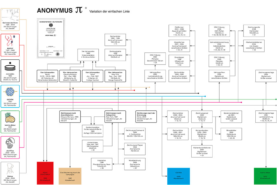 ANONYMUS PI - Variation der einfachen Linie ist eine Sammlung von Zeichnungszyklen, die alle dem Konzept der „einfachen Linie“ folgen, sich aber durch unterschiedliche formale Definitionen von einander unterscheiden. Variationsmöglichkeiten ergeben sich durch die Veränderung von Material, Farbe und Stil. Zum gegenwärtigen Zeitpunkt umfasst das Archiv mehrere tausend Handzeichnungen in neun verschiedenen Kategorien: